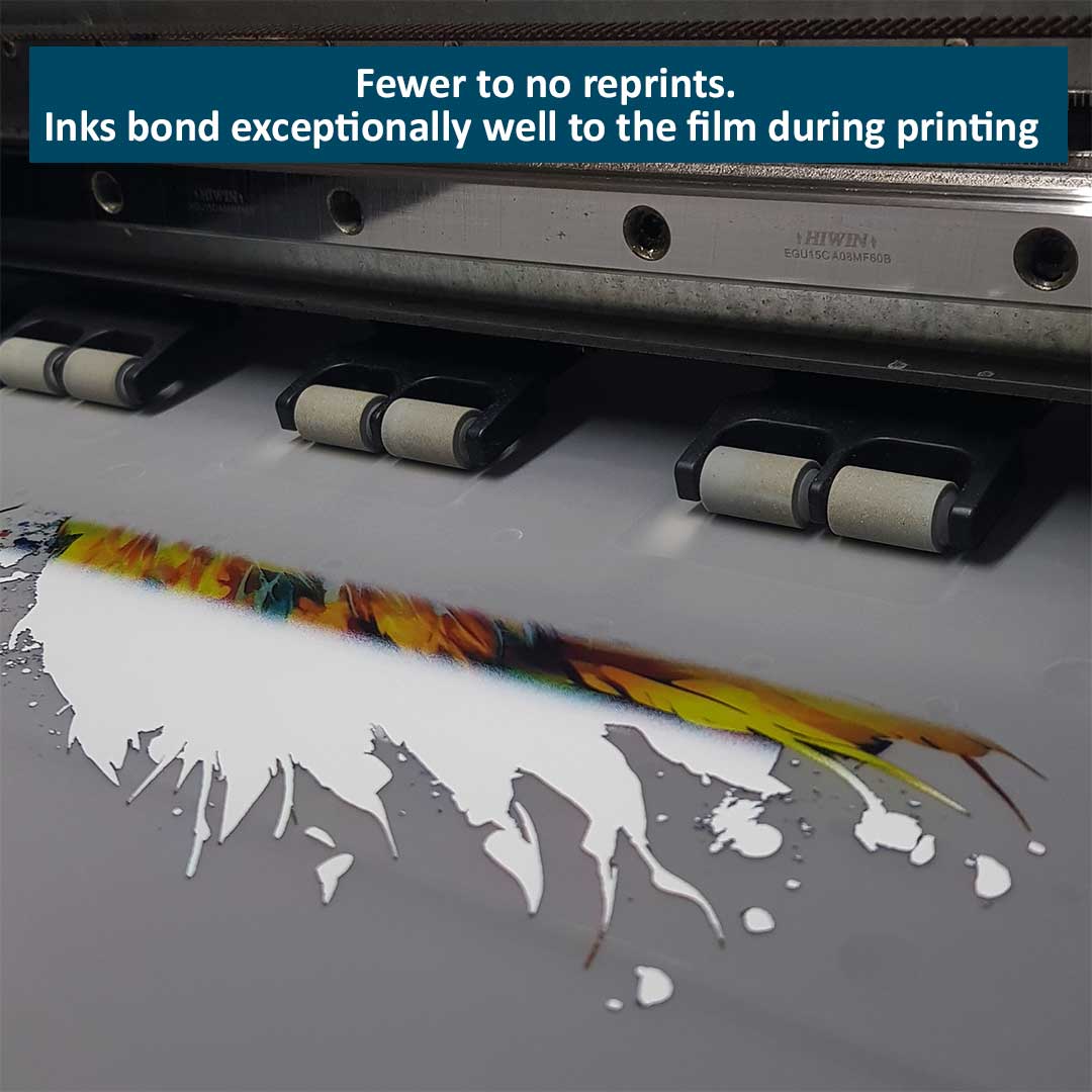 • Inks bond very well to the film during printing (no ink bleeds), resulting in fewer to no reprints thus saving both time and money