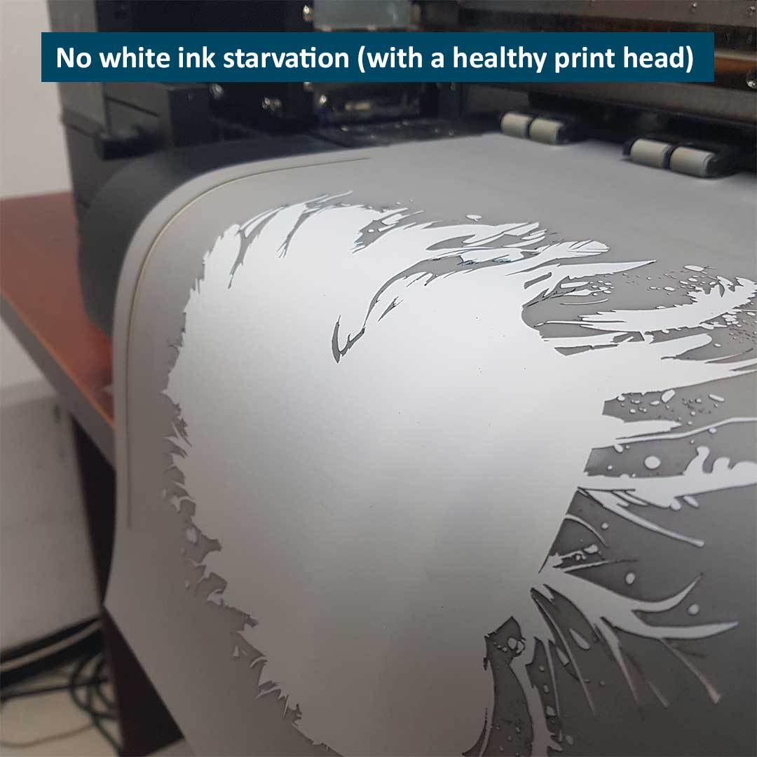 • Vibrant colours combined with low viscosity to reduce the risk of white ink starvation